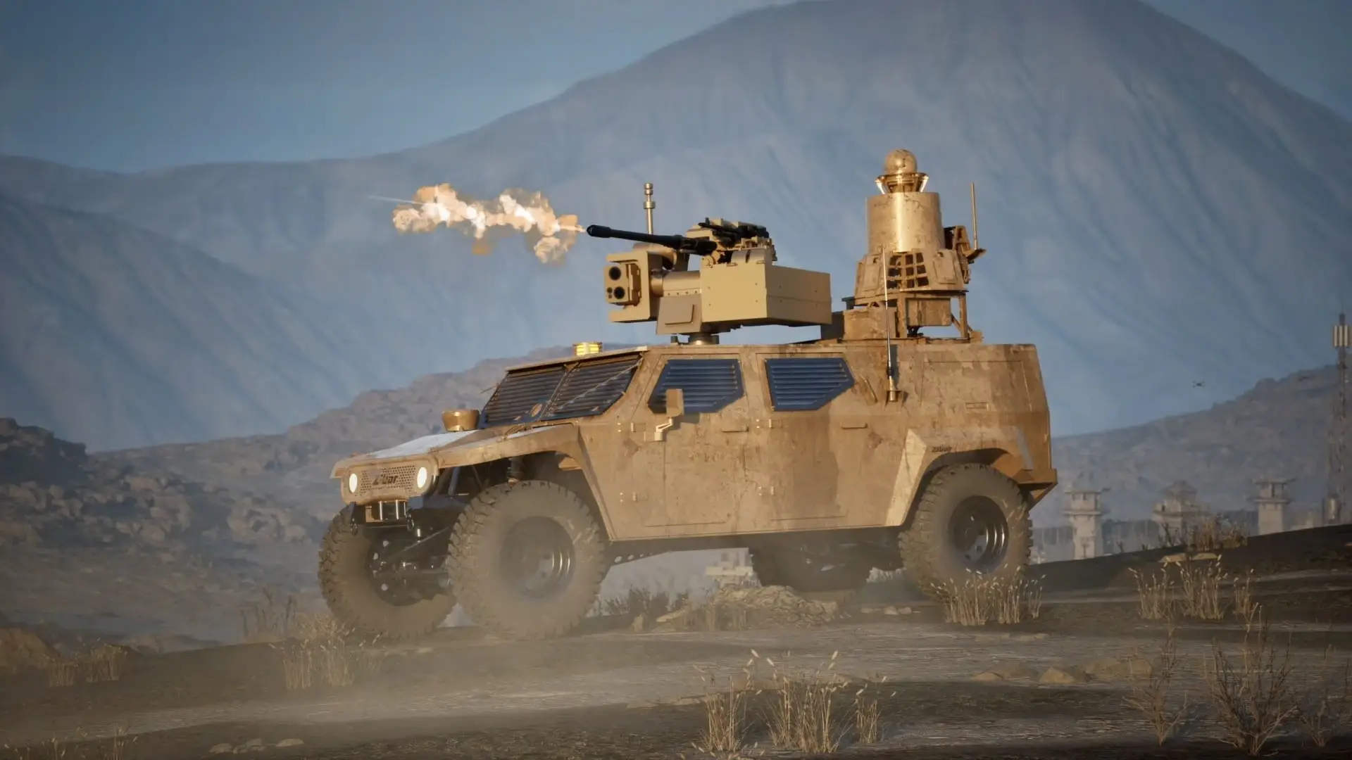 A military vehicle in a rocky mountainous landscape fires a weapon at a swarm of red drones in the sky, with explosions visible among the drones targeted by the ELI-4030 Drone Guard Gen 5 and other vehicles and buildings in the background.